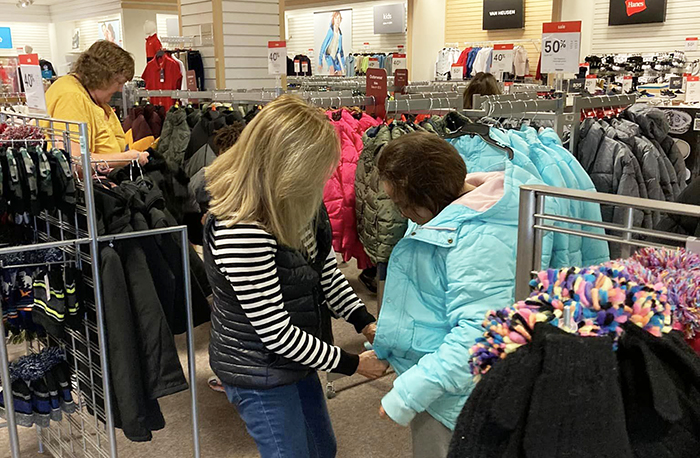 Sue Juba looking at coats.
