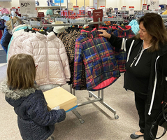 Char Lorfido helps her child try on a coat.